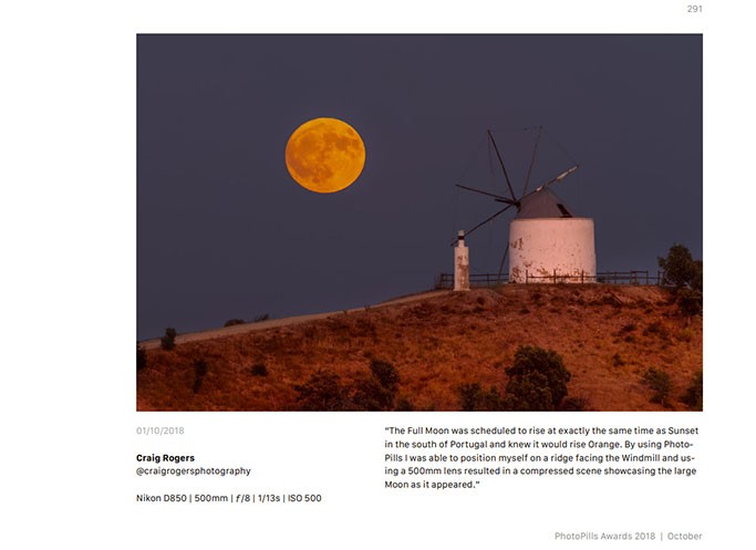 in the south of Portugal and knew it would rise Orange. By using PhotoPills (Sun/Moon/Stars tracker) I was able to position myself on a ridge facing the Windmill and using a 500mm lens resulted in a compressed scene showcasing the large Moon as it appeared. It appears in the 2018 PhotoPiller of the Year eBook which can be downloaded (for free) from the PhotoPills Website.