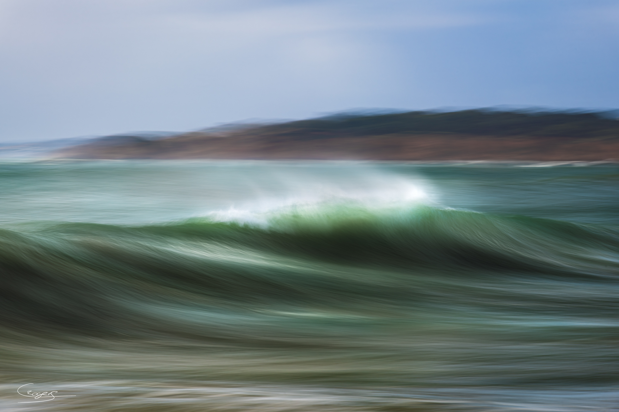 Description: Embrace the beauty of nature as another swell rises, crafting a magnificent wave. The strong winds carry the spray backwards.