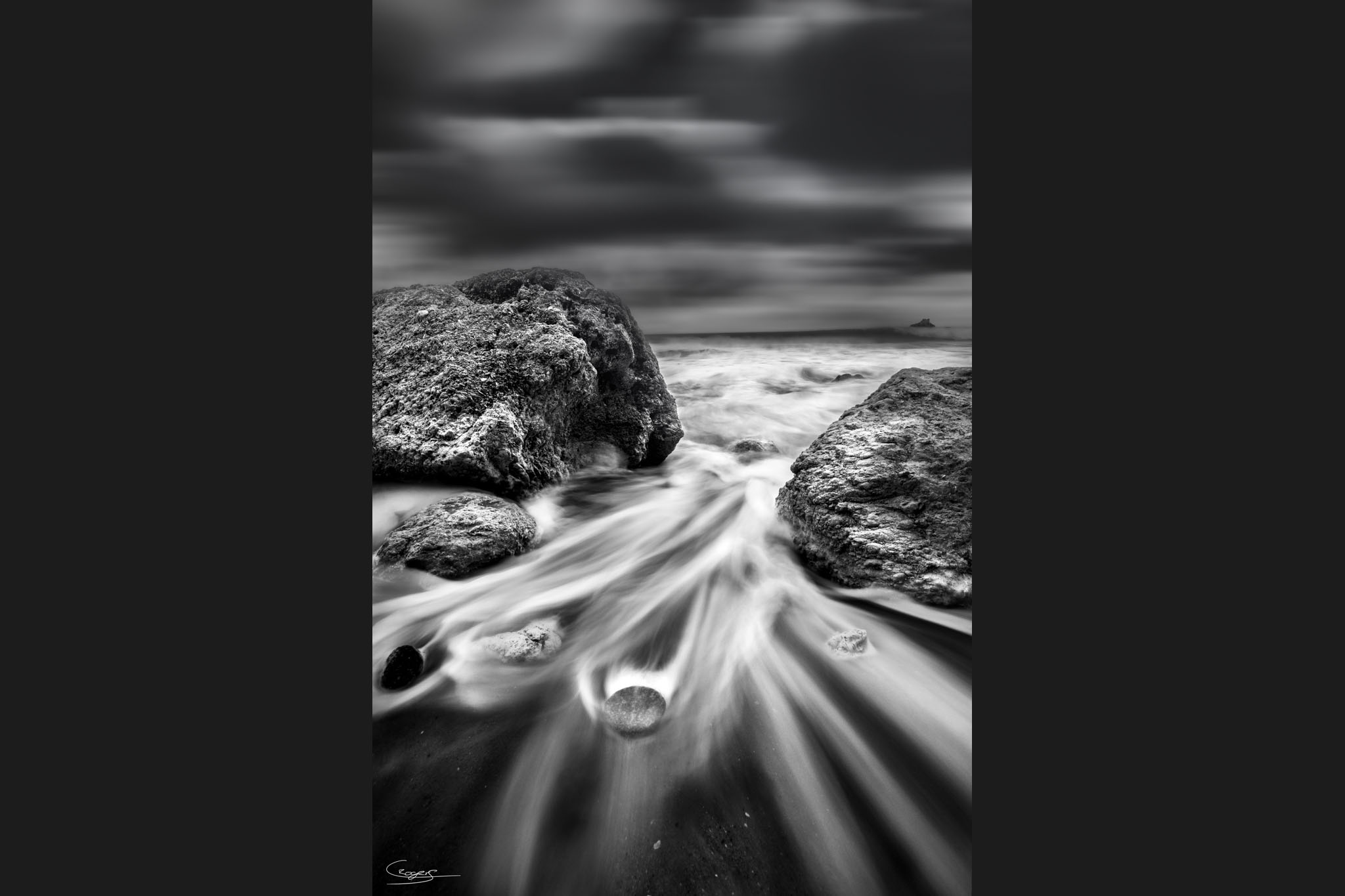 Description: The aftermath of the storm revealed the fierce beauty of the sea. As a strong wave crashed, it took destroyed one of my boots, reminding me of nature’s power. This black and white image captures the moment just after as the wave retreats to the ocean.