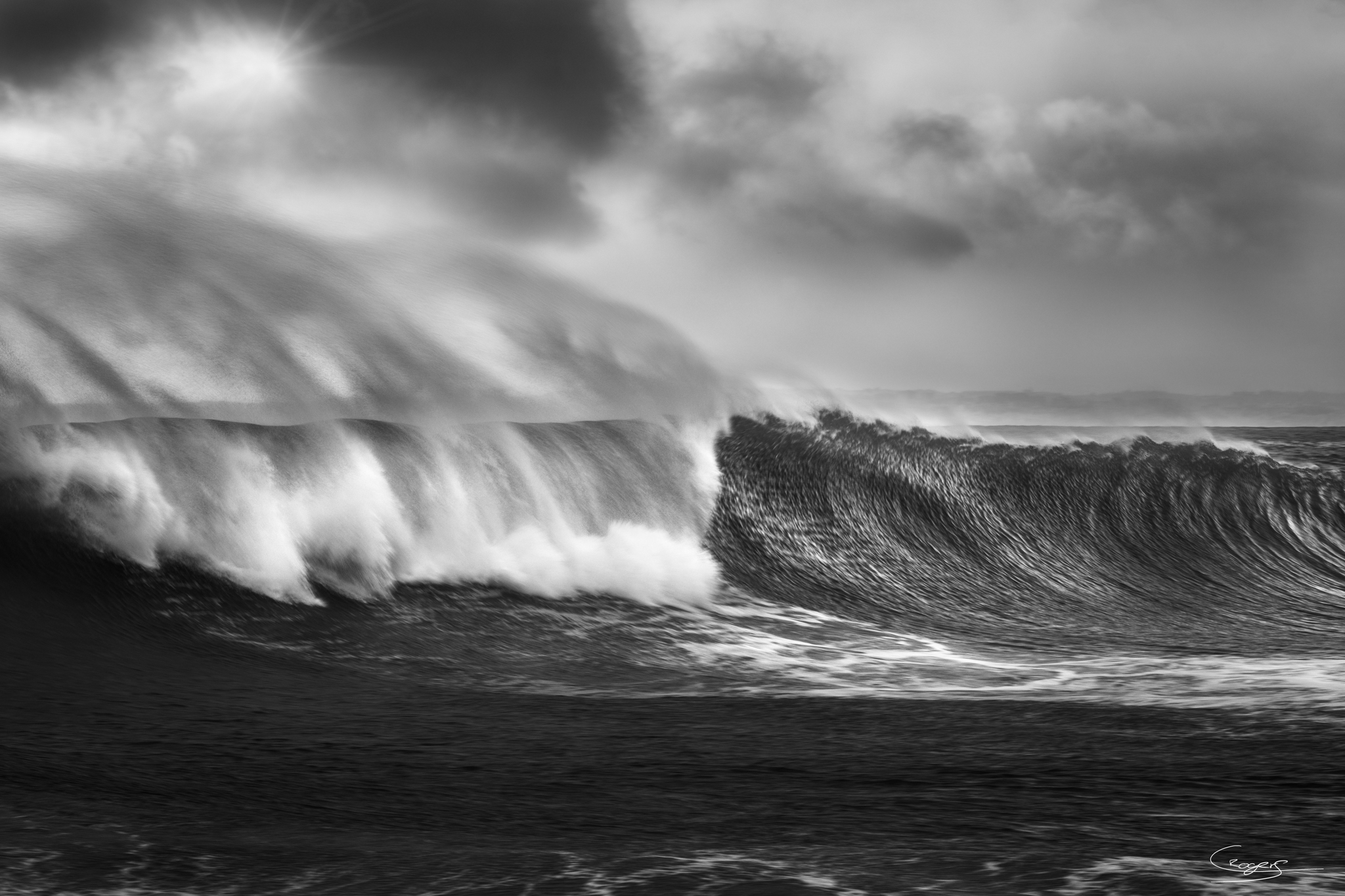 Description: At Praia da Rocha, the large waves from Storm Ingrid crash with a powerful beauty, merging with the rain clouds above.